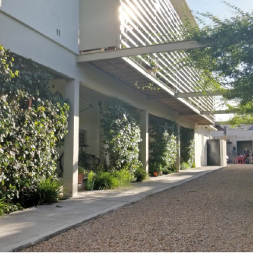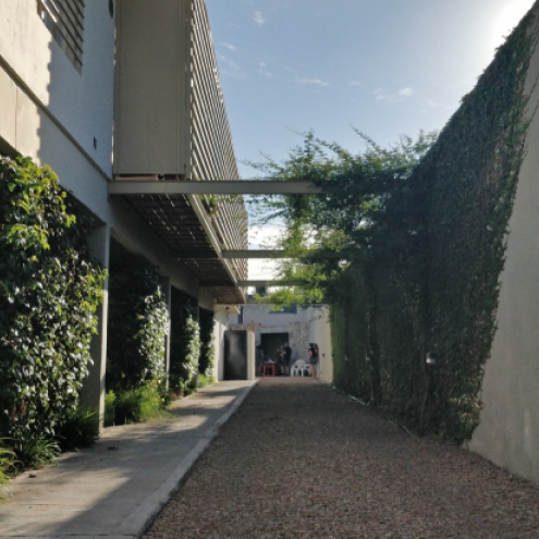 El conjunto está compuesto por 5 unidades funcionales de tipología tríplex, cada una con cochera y muy bajas expensas. Una calle interior, totalmente parquizada, proporciona una muy agradable transición entre el espacio público y el acceso a las unidades, desembocando en el sector de cocheras y el quincho.